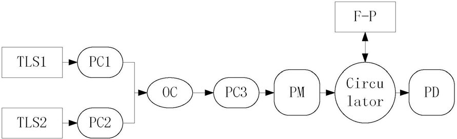 第一可调谐激光器的输出端连接第一偏振控制器的输入端,第一偏振控制器的输出端连接第一光耦合器的输入端,第二可调谐激光器的输出端连接第二偏振控制器的输入端,第二偏振控制器的输出端连接第一光耦合器的输入端,第一光耦合器的输出端连接第三偏振控制器的输入端,第三偏振控制器的输出端连接光电调制器的输入端,光电调制器的输出端连接光环形器的第一端口,光环行器的第二端口连接法布里‑珀罗激光器,光环行器的第三端口连接光电探测器。