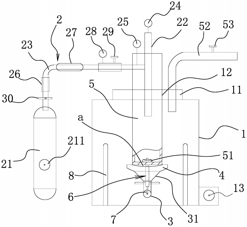 B、吹洗,将气瓶(21)打开,C02气体从进气管路(23)进入至竖直管路(22),最终C02气体进入至高压釜(5)内,吹洗2-3分钟,以便置换掉管路和高压釜(5)中的空气;