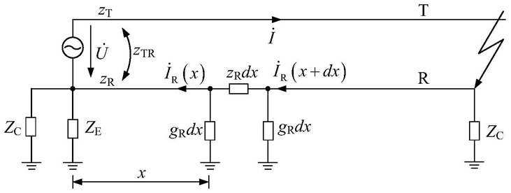 步骤六、根据直供牵引网短路时的气象条件,确定轨-地分布电导gR,按式②计算钢轨特征阻抗Z0和钢轨传播系数γ,步骤七、通过直供牵引网的测量短路电抗XmT和由式①计算出的直供牵引网单位电抗xe2初步确定故障点距供电线上网点的距离l(0),实际故障位置lreal