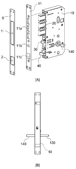 凸轮件,具有与所述第二轴外径相同的连接孔,可以插入所述第一轴或者所述第二轴,所述凸轮件包括,旋转时,锁进所述锁舌的一对插销凸轮,和设置在所述一对插销凸轮之间,旋转时解锁门栓的锁死轮;