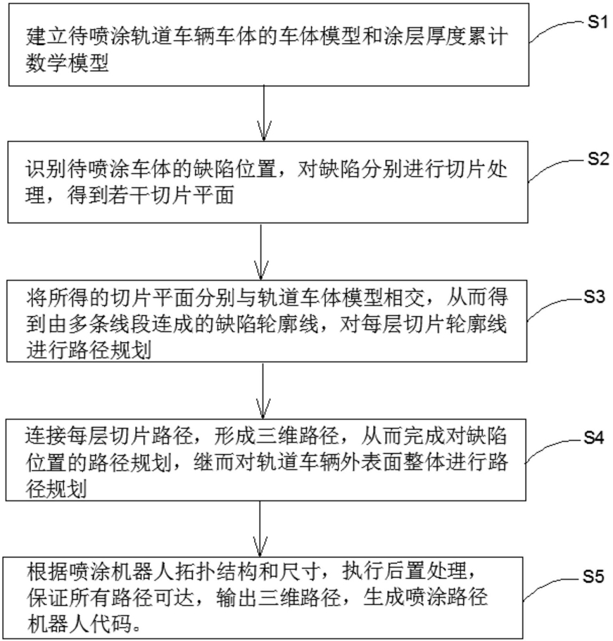 1.一种轨道车辆车体腻子自动化离线喷涂连续路径规划方法,其特征在于,包括如下步骤:S1、建立待喷涂轨道车辆车体的车体模型和涂层厚度累计数学模型;S2、识别待喷涂车体的缺陷位置,对缺陷分别进行切片处理,得到若干切片平面;S3、将所得的切片平面分别与轨道车体模型相交,从而得到由多条线段连成的缺陷轮廓线,对每层切片轮廓线进行路径规划;S4、连接每层切片路径,形成三维路径,从而完成对缺陷位置的路径规划,继而对轨道车辆外表面整体进行路径规划;所述S1包括如下步骤:S101、以待喷涂轨道车体表面任一点作为坐标原点,以地轴为X轴,竖轴为Y轴,喷涂方向为Z轴建立空间直角坐标系O‑XYZ;S102、建立涂层厚度累积数学模型,导入待喷涂轨道车辆车体的三维STL模型,导入时判断该模型是二进制还是ASCII代码,并显示该模型;所述S2具体为:识别出每一个待喷涂缺陷位置,对缺陷分别进行切片处理,预设的切片厚度为δ,以待喷涂表面最低处,并平行于xoy平面为基准,初始切片平面z0,沿z轴负方向依次偏移距离δ,依次形成切片平面zi;具体包括如下步骤:S201、以轨道车体待喷涂表面最高处偏移距离h位置,并平行于XOY平面形成的水平面zsafe为基准,建立机器人喷涂三维笛卡尔直角坐标系o‑xyz,S202、根据缺陷位置最低处z轴坐标,建立平行于xoy平面新建平面z0;S203、计算缺陷位置最低处z轴坐标zmin和预设的车体缺陷喷涂完成后z轴坐标zmax,得到待喷涂位置总厚度d=zmax‑zmin;S204、计算切片层数n,若满足不等式m*δ≤d<(m+1/2)*δ,则n=m;若满足不等式(m+1/2)*δ≤d