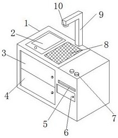 1.一种财务咨询报表整合装置,其特征在于:包括柜体(1)、平板电脑(2)、短时保存柜(3)、长时保存柜(4)、送纸口(5)、控制按钮(7)、转动防滑板(8)、摄像头(10)、保护板(11)、转动式阻隔板(12)、盖章组件(15)、分隔板(16)和电机(17);其中,所述柜体(1)的上端一侧安装有平板电脑(2),所述柜体(1)的上端中间位置安装有转动防滑板(8),所述转动防滑板(8)的一端安装有支撑架(9),所述支撑架(9)的末端安装有摄像头(10),所述转动防滑板(8)远离柜体(1)的一侧设置有控制按钮(7),所述柜体(1)的中间位置安装有短时保存柜(3),所述短时保存柜(3)的下方设置有长时保存柜(4),所述短时保存柜(3)靠近控制按钮(7)的一侧设置有送纸口(5),所述送纸口(5)的下端设置有取件窗(6),所述短时保存柜(3)和长时保存柜(4)的外表面设置有一侧保护板(11),所述短时保存柜(3)和长时保存柜(4)的进口处均设置有转动式阻隔板(12),所述短时保存柜(3)和长时保存柜(4)之间的夹板的上端设置有分隔板(16),所述转动防滑板(8)的中间位置连接有电机(17),所述柜体(1)一侧与控制按钮(7)对应的箱体内设置有限位隔板(14),所述限位隔板(14)上方安装有盖章组件(15),所述限位隔板(14)的下方安装有备用蓄电池(13)。2.根据权利要求1所述的一种财务咨询报表整合装置,其特征在于:所述保护板(11)包括细沙阻燃层(111)、隔热板(112)和降温水层(113),其中,所述隔热板(112)的外侧设置有一层细沙阻燃层(111),所述隔热板(112)的内侧设置有一层降温水层(113)。3.根据权利要求1所述的一种财务咨询报表整合装置,其特征在于:所述盖章组件(15)包括连接杆(151)、印章(152)、磁石(153)、复位弹簧(154)和电磁铁(155),其中,所述盖章组件(15)的筒体内部上端安装有电磁铁(155),所述电磁铁(155)的下端连接有复位弹簧(154),所述复位弹簧(154)的下端连接有磁石(153),所述磁石(153)的下端设置有连接杆(151),所述连接杆(151)的底部连接有印章(152),所述印章(152)分为上下l两部分,第一次印章(152)下降,下部分盖在纸上,然后就不动了,上部分随着电磁铁(155)吸力上去,再下来,所述转动式阻隔板(12)均通过小型电动机进行转动调节。4.根据权利要求1所述的一种财务咨询报表整合装置,其特征在于:所述电机(17)的转轴与转动防滑板(8)通过键连接固定,所述转动防滑板(8)左右可转动最大角度为三十度,所述短时保存柜(3)和长时保存柜(4)的柜门均采用与保护板(11)相同的结构设计。5.根据权利要求1所述的一种财务咨询报表整合装置,其特征在于:所述盖章组件(15)的筒体内部设置有限定连接杆(151)上下滑动的限位快。6.根据权利要求1所述的一种财务咨询报表整合装置,其特征在于:所述平板电脑(2)与摄像头(10)之间通过数据线电性连接,所述平板电脑(2)通过内置的无线网络模块与外部存储器通讯连接。7.根据权利要求1所述的一种财务咨询报表整合装置,其特征在于:所述转动式阻隔板(12)的下端设置有测温用的传感器,所述短时保存柜(3)和长时保存柜(4)内部设置有用于除湿、加湿的加湿器和恒温的控温箱。8.根据权利要求1-7任一项所述的一种财务咨询报表整合装置,其整合方法主要包括以下步骤:(1)备份存放:将报表放置在转动防滑板(8)的表面,摄像头(10)将转动防滑板(8)上的报表进行拍摄,然后将拍摄的图片传输给平板电脑(2),平板电脑(2)将拍摄的图片保存在内部存储卡中,同时平板电脑(2)的通过内置的无线网络模块将拍摄图片传输到外部存储