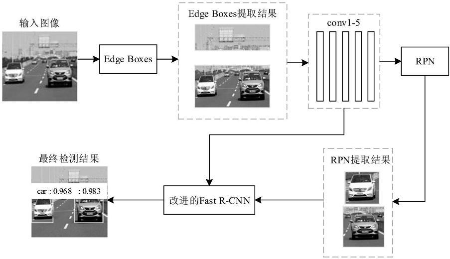 3.根据权利要求1所述的基于深度学习的车辆检测方法,其特征在于,所述的步骤2中,RPN由六个串联的卷积层和两个并行的卷积层构成,两个并行的卷积层中一个卷积层负责输出一系列的矩形候选框的位置坐标值,另一个卷积层负责输出该矩形候选区域是否为目标的置信度;改进的Fast R-CNN由五个卷积层、三个RoI池化层、一个全连接层和两个并行的全连接层构成,两个并行的全连接层中一个全连接层通过Softmax预测候选区域属于每个类别的概率(置信度),另一个全连接层通过边框回归输出矩形候选框更合适的位置。