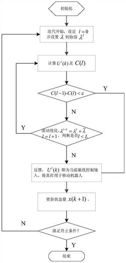 3.1:初始化:k=0时刻,选取参考路径的期望线速度vr和角速度wr,预测性能指标中的μ、s、P和N,初始误差状态量x(0)、数据包接收概率 以及量化密度δ,最大迭代次数L和迭代步长