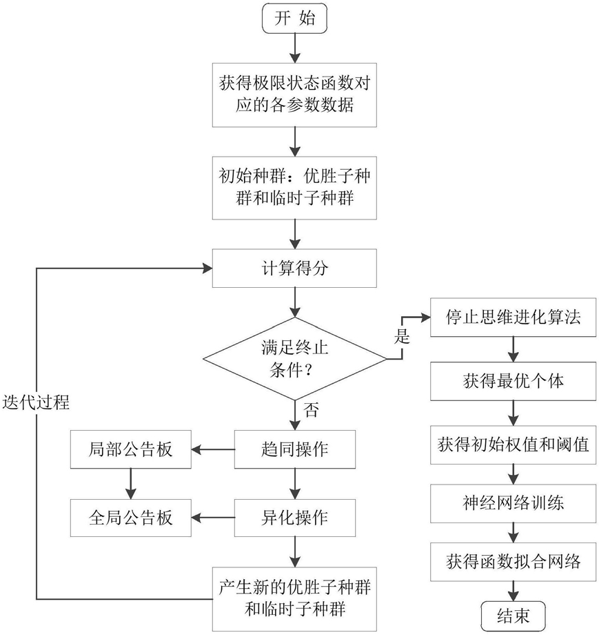 步骤二,基于思维进化算法和神经网络建立优化的极限状态函数拟合程序,首先设置该程序的输入参数,产生初始种群、优胜子种群和临时子种群,进行迭代趋同和异化操作,当程序中思维进化算法满足迭代停止条件后,获得最优个体输出,将其作为下一步计算的初始权值和阈值;
