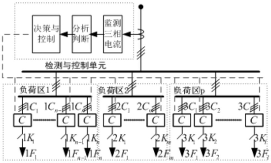 检测与控制单元,根据三相电流的检测结果,经过上表所示的分析与判断,确定后续要开放供电选相,发送选择控制信号给相别选择控制器,使相别选择控制器完成相别选择,确定后续将给单相负载供电的相别,后续接入的单相负载由所选择的相别进行供电,从而动态地实现供配电系统负荷的三相平衡控制。