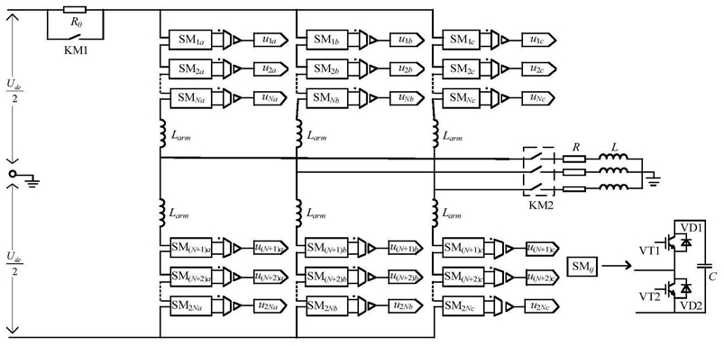 接入直流母线电压,通过限流电阻(R0)对三相逆变电路中每一相的低电压组的N个MMC子模块的电容(C)进行充电;