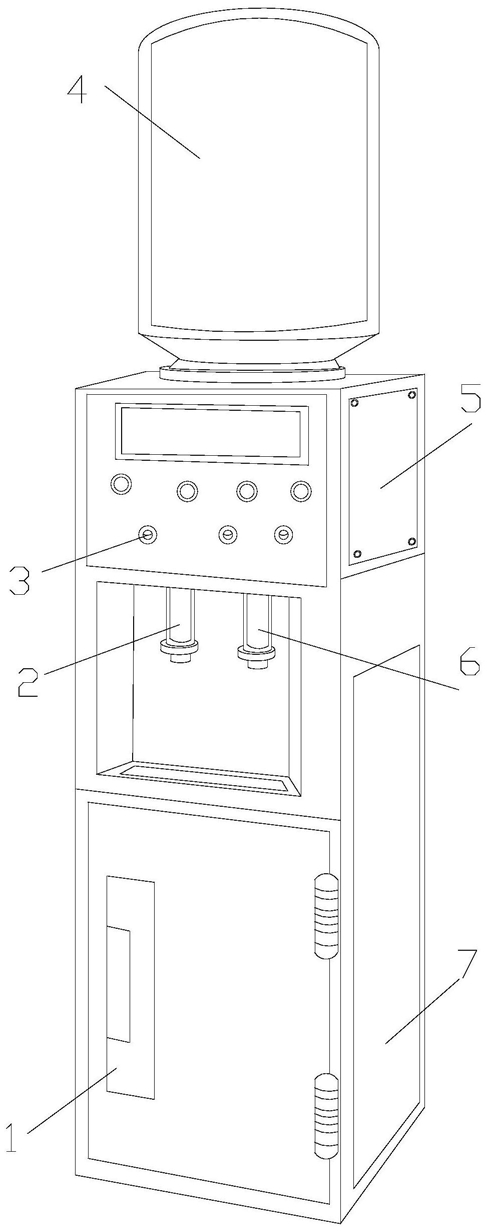 1.一种智能对象识别饮水装置,其结构包括机箱(1)、冷水出水管(2)、液晶智能识别面板(3)、桶装水(4)、防干烧装置(5)、热水出水管(6)、机体(7),所述机箱(1)嵌入于机体(7)的底部,所述冷水出水管(2)的首端安装于的机体(7)的正表面,所述热水出水管(6)的一端设有冷水出水管(2),所述机体(7)的正表面设有液晶智能识别面板(3),所述桶装水(4)的末端与机体(7)首端相连接,所述防干烧装置(5)安装于机体(7)的内部顶端,其特征在于:所述防干烧装置(5)包括水位通知机构(51)、电源切断机构(52)、动力机构(53)、均匀加热机构(54)、过滤净化机构(55)、自动关闭机构(56)、动力传动机构(57)、辅助马达机构(58),所述水位通知机构(51)的首端与电源切断机构(52)末端啮合连接,所述电源切断机构(52)与动力机构(53)相扣合,所述动力机构(53)与辅助马达机构(58)电连接,所述辅助马达机构(58)与动力传动机构(57)活动配合,所述过滤净化机构(55)的首端设有自动关闭机构(56),所述均匀加热机构(54)安装于过滤净化机构(55)的末端,所述自动关闭机构(56)与动力传动机构(57)相扣合;