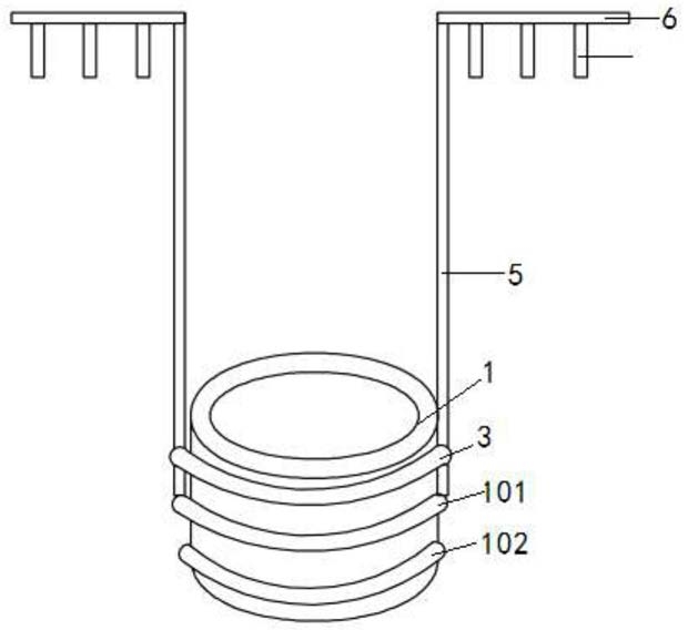 1.一种山核桃采摘装置,其特征是,包括可与树干接触的气囊(1),与气囊连接的气泵(2),设于圆筒状气囊外周面上的由上至下依次排列的第一金属束缚环(3)、第二金属束缚环(101)和第三金属束缚环(102),与3个金属束缚环连接的M条可伸缩管(5),M≥3;每条可伸缩管上端均设有横管(6),每条横管上均设有若干个竖向延伸的击打棒(61),第二金属束缚环上设有M个电机(8),M个电机的转轴分别与对应的可伸缩管连接,各条可伸缩管下端均与高压气罐连通,各条横管下侧面上均设有若干个出气孔,高压气罐上设有电磁阀(4),每个可伸缩管分别与第一金属束缚环和第三金属束缚环转动连接,气囊中设有压力传感器(103),还包括控制器(9),控制器分别与气泵、压力传感器、电磁阀和各个电机电连接;第一金属束缚环、第二金属束缚环和第三金属束缚环均包括弧形圈(31),与弧形圈连接的弧形转动杆(32),弧形圈上设有锁柱(311),弧形转动杆上设有若干个间隔排列的锁孔(321)。