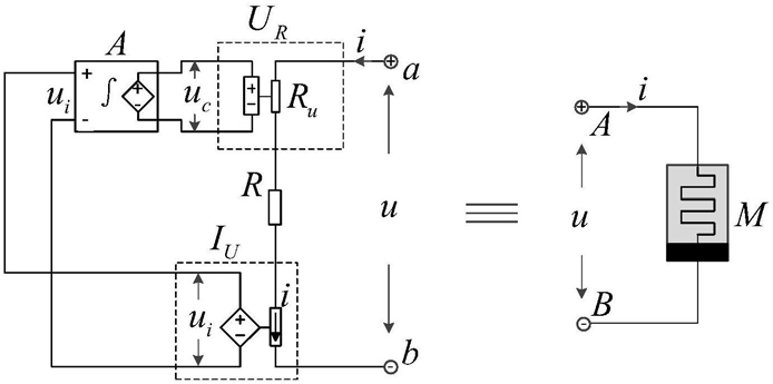 1.一种极简的浮地荷控忆阻器仿真电路,其特征在于,包括端口a、端口b、压控电阻UR、电阻R、电流控制电压源IU和电压积分器A,所述压控电阻UR包括电压控制端uc和受控电阻Ru,所述压控电阻UR内受控电阻Ru的电阻值受电压控制端uc的电压值控制,所述电流控制电压源IU包括电流控制端i和电压源输出端ui,所述电流控制电压源IU内电压源输出端ui的电压值受电流控制端i的电流值控制,所述电压积分器A包括电压输入端ui和电压输出端uc,所述端口a、压控电阻UR内受控电阻Ru、电阻R、电流控制电压源IU内电流控制端以及端口b为串联关系,所述电流控制电压源IU的电压源输出端与电压积分器的电压输入端相连,所述电压积分器电压输出端与压控电阻的电压控制端相连;从时刻t0至tn,所述电压积分器A内电压输出端的电压值 Ki为电压积分器A的比例系数。