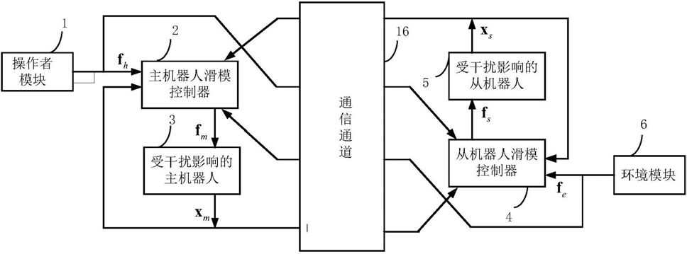 1.一种非线性遥操作双边控制系统,包括操作者模块、受干扰影响的主机器人、主机器人滑模控制器、通信通道、受干扰影响的从机器人、从机器人滑模控制器、环境模块;主机器人的位置xm、操作者与主机器人之间的交互力fh经通信通道传送给从机器人滑模控制器;从机器人的位置xs、从机器人与环境之间的交互力fe经通信通道反馈给主机器人滑模控制器;