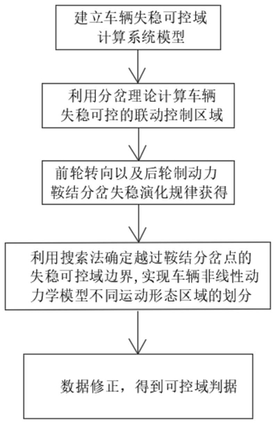 利用后轴侧滑后前轮侧向力变化特性、以及轮胎附着椭圆,分析前轮转向、后轮制动力的镇定能力,分析得到横摆角速度、质心侧偏角随转角变化的分岔特性,围绕鞍结分岔点利用搜索法确定越过鞍结分岔点的失稳可控域边界,实现车辆非线性动力学模型不同运动形态区域的划分;