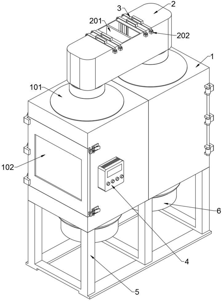 所述隔板将除尘箱的内部空间一分为二形成两处除尘腔,此两处除尘腔的顶板上均贯穿开设有两处长条插槽,且两处除尘腔的左右内壁上与四处长条插槽对应焊接设置有四组竖直轨道,四处集尘滤网就通过与四组竖直轨道的对应插接被下滑插置于除尘箱的内部;