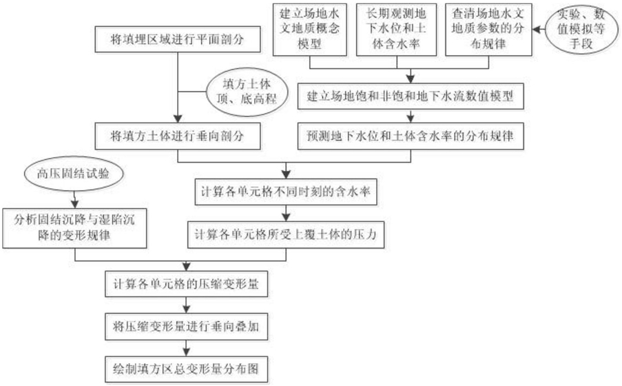 所述步骤三中高填方黄土体沉降量的预测采用区域沉降量计算和采用空间剖分的方式,得到不同时刻的沉降量的空间分布图;