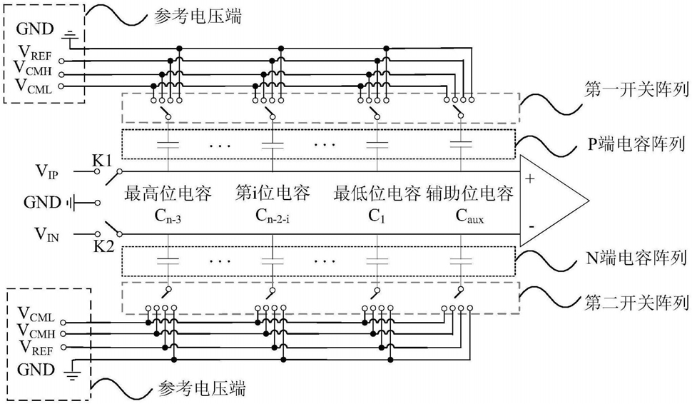 所述第一开关阵列中每个切换开关分别连接所述参考电压端和P端电容阵列中相应电容的下极板;P端电容阵列中所有电容的上极板相连接,并通过第一输入开关K1接正相输入VIP;