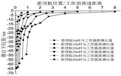 (2)在距采空区顶板分别为5m、10m、20m、30m、50m、80m的上覆岩体内布设监测点进行覆岩位移变化监测,获取距采空区顶板不同位置处覆岩移动与某一定采空区尺寸也即开采工作面推进距离的对应关系;所述采空区体积指开采工作面推进距离;