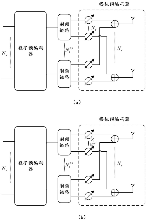 S1:基站端将Ns个数据流通过Nt个发送天线发送出去,发送端可用的射频链路的个数为每个射频链路和Nt个发送天线连接时为全连接结构;当每个射频链路和 个发送天线连接时为部分连接结构,混合预编码的码本矩阵为Vt=VRFVD,其中VRF为模拟码本,VD为数字码本;