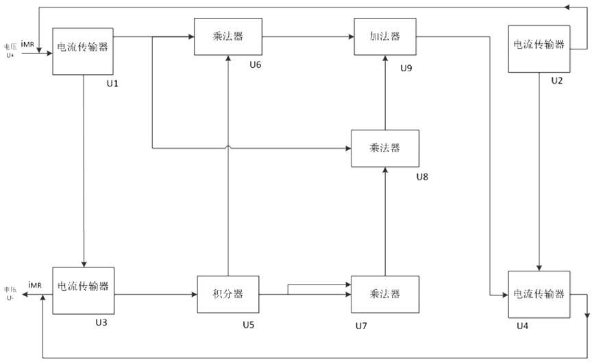 电流传输器U3的引脚5与电容C1连接并接地,形成积分电路;电流传输器U3的引脚6与电阻R4的一端连接,电阻R4的另一端连接到积分器U5的2引脚;电流传输器U4的引脚3与加法器U9的引脚6相连;乘法器U4的引脚7、4分别接V1+和V1-;乘法器U4的引脚5与乘法器U3的引脚