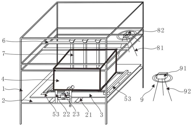 1.利用透明土研究水平荷载下桩土作用的装置,其特征在于,包括支撑框架和模型槽放置板,所述支撑框架的中下部固定安装有滑轨固定板,所述滑轨固定板上至少固定有两条滑轨;所述模型槽放置板的下表面固定安装有与所述滑轨配合的滑轮,所述模型槽放置板的上表面设置有透明的模型槽及用于对模型槽进行限位的限位装置;