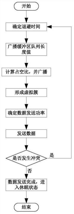节点确定了发送功率之后,就会发送数据,节点每发送一次数据要判断是否发生冲突,如果发生冲突,则节点重新确定退避时间,进行新的一轮的数据发送,如果节点没有发生冲突,当发送完成之后,节点进入休眠状态。