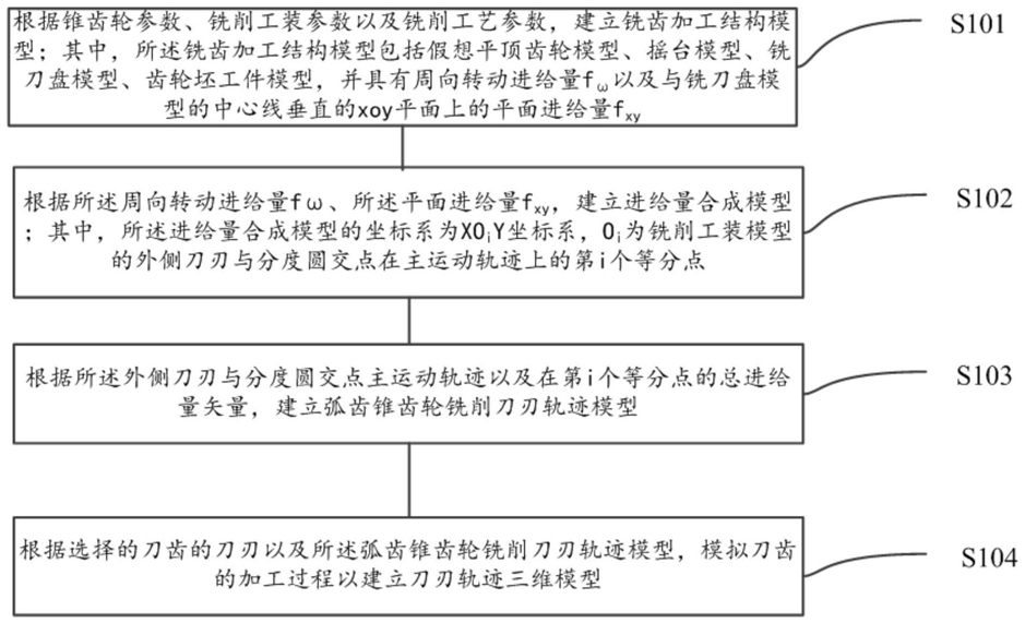 根据锥齿轮参数、铣削工装参数以及铣削工艺参数,建立铣齿加工结构模型;其中,所述铣齿加工结构模型包括假想平顶齿轮模型、摇台模型、铣刀盘模型、齿轮坯工件模型,并具有周向转动进给量fω以及与铣刀盘模型的中心线垂直的xoy平面上的平面进给量fxy;