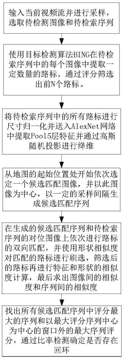 分别从待检测序列和候选匹配序列的起始位置取一个图片以计算第一对图像之间的相似度,路标的匹配执行双向搜索,即如果图像s中路标j是图像r中路标i在图像s中路标特征相似度的最近邻,同时图像r中的路标i是图像s中路标j在图像r中路标特征相似度的最近邻,那么路标i和路标j则构成一对候选路标匹配对,如果候选匹配路标对之间的形状相似则确认二者为真实的路标匹配对;