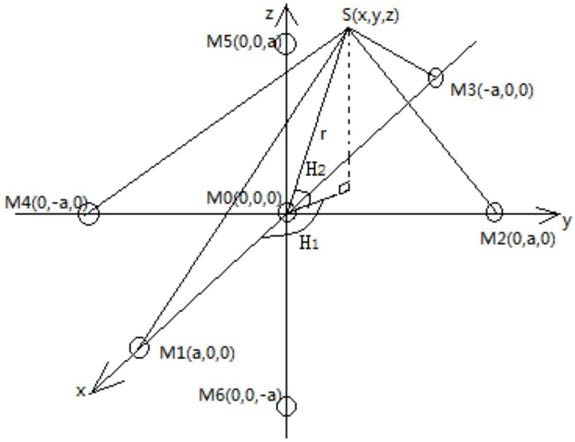 1.一种基于七元十字阵的空间声源定位反演方法,其特征在于,包括以下步骤:步骤1),令声音传播速度为c,声源S的直角坐标为(x,y,z),r为声源S到坐标原点M0的距离,声源S传播到传声器M0(0,0,0)、M1(a,0,0)、M2(0,a,0)、M3(‑a,0,0)、M4(0,‑a,0)、M5(0,0,a)、M6(0,0,‑a)的时间分别为t0、t1、t2、t3、t4、t5、t6,a大于0;T1=t1‑t0,T2=t2‑t0,T3=t3‑t0,T4=t4‑t0,T5=t6‑t5;H1为声源S的水平偏角,范围在[0°,360°]之间;H2为声源S的仰角,范围在[‑90°,90°]之间,H2的值若为正代表声源在X0Y平面上方,此时T5>0;H2的值若为负代表声源在X0Y平面下方,此时T5<0;声源S的球坐标为(r,H1,H2);H1'、H2'分别为正演值H1、H2对应的反演值;