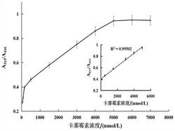 20min,然后向每个离心管中加入500μL的纳米溶液,扫描其紫外可见吸收光谱,根据不同卡那霉素浓度下测定的吸收值绘制卡那霉素浓度的标准曲线,线性范围是80-5000nmol/L,检测限为60nM,标准曲线的线性方程为y=0.00011x+0.39901,y为不同卡那霉素浓度下紫外吸收值比率,x为相应卡那霉素的浓度,线性相关性>0.995。