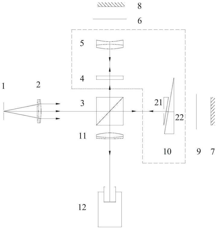 在所述的第一光路中,置入楔形棱镜组,所述楔形棱镜组由楔角相同的第一楔形棱镜和第二楔形棱镜组成,所述第一楔形棱镜和第二楔形棱镜互补放置,内部相对着的两个棱面是各自楔角相邻的棱面,所述第一楔形棱镜固定在所述第一光路中,其楔角相邻的朝外的棱面与所述分束立方棱镜相对,光束垂直入射朝外的楔角相邻的的棱面;所述第二楔形棱镜可沿所述的楔形棱镜组内部的相对着的平行的棱面内且垂直棱的方向移动;
