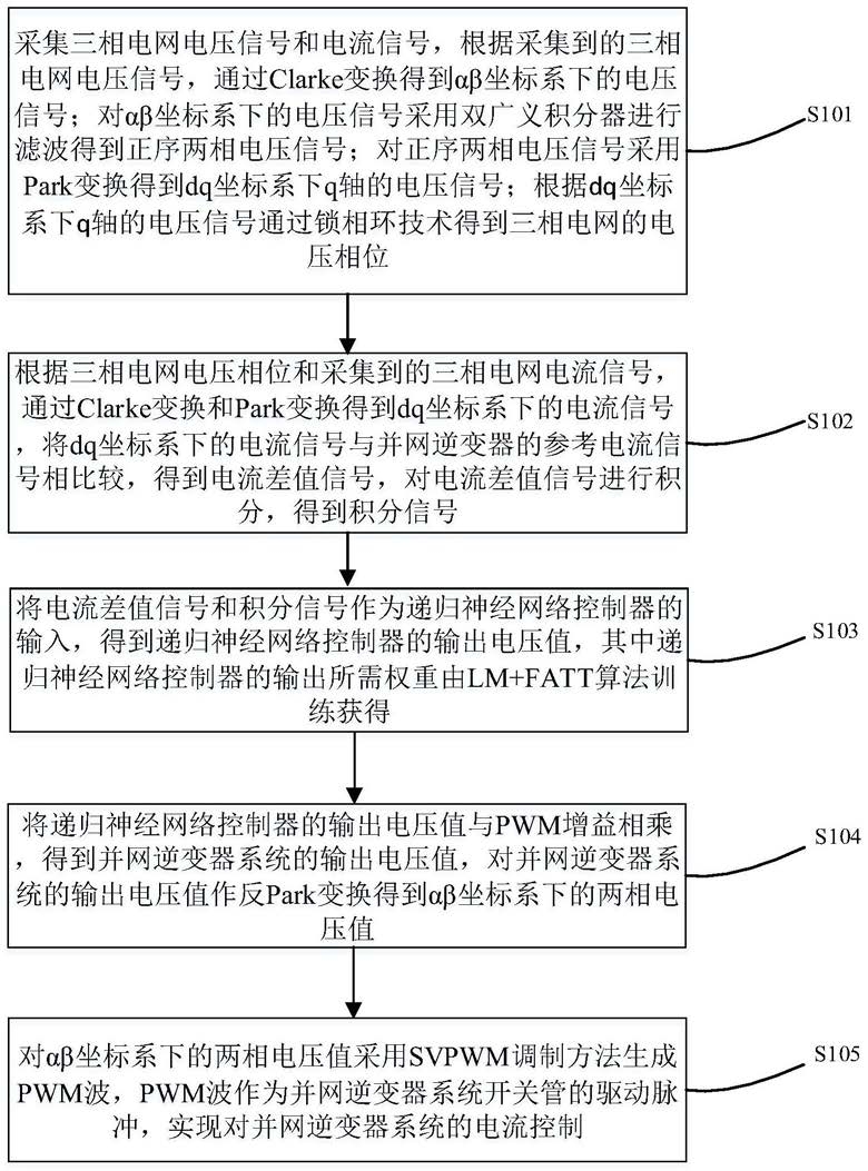 S104:将递归神经网络控制器的输出电压值与PWM增益相乘,得到并网逆变器系统的输出电压值,对并网逆变器系统的输出电压值作反Park变换得到αβ坐标系下的两相电压值;