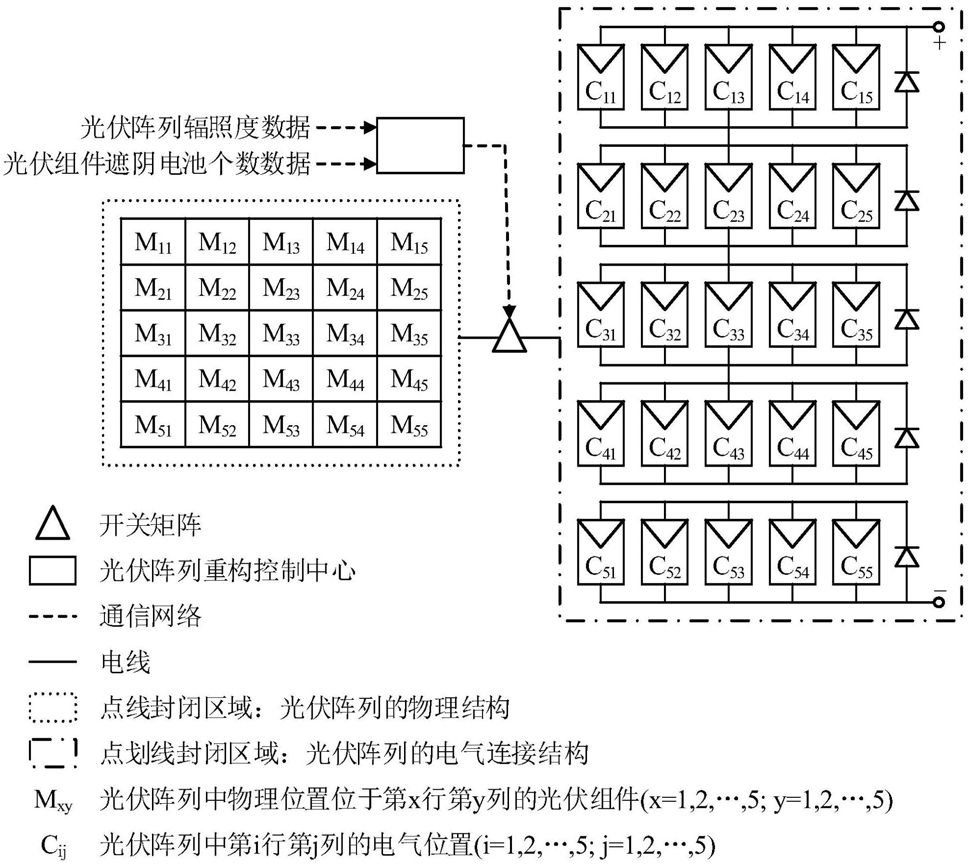 步骤2:对于共串联有k块光伏电池的光伏组件Mxy,将组件Mxy的遮阴电池个数记为Rxy,在某一特定的阴影分布情况下,检测光伏阵列光照区与阴影区的辐照度与每块组件的遮阴电池个数,并将光伏阵列光照区与阴影区的辐照度数据与每块组件遮阴电池个数数据通过通信网络传送到光伏阵列重构控制中心;