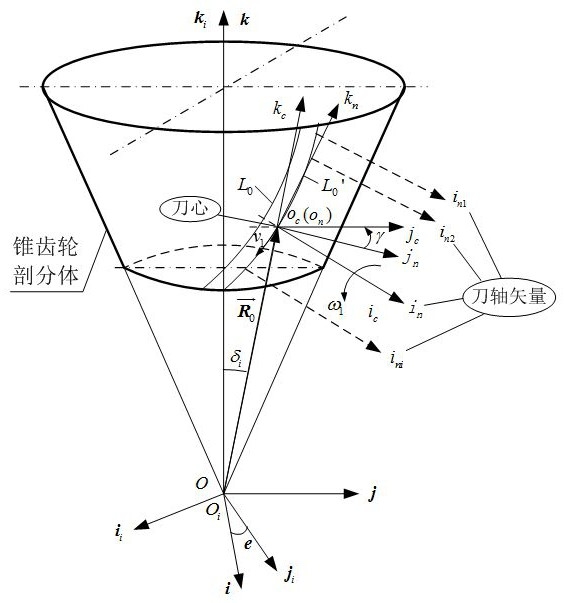 1.一种剖分式等基圆锥齿轮切齿运动轨迹计算方法,其特征在于:包括如下步骤:步骤1:将相互啮合的一对特大型等基圆锥齿轮的大轮划分为若干锥齿轮剖分体,建立轮坯坐标系和空间固定坐标系,定义轮坯坐标系 轴和空间固定坐标系 轴的夹角为e定义被加工的第k个左旋凹齿面的夹角e=emkl,定义被加工的第k个左旋凸齿面的夹角e=enkl,定义被加工的第k个右旋凹齿面的夹角e=emkr,定义被加工的第k个右旋凸齿面的夹角e=enkr,式(01)~(04)中,“±”在沿逆时针方向依次加工齿面时取“+”,“在沿顺时针方向依次切齿时取“-”;