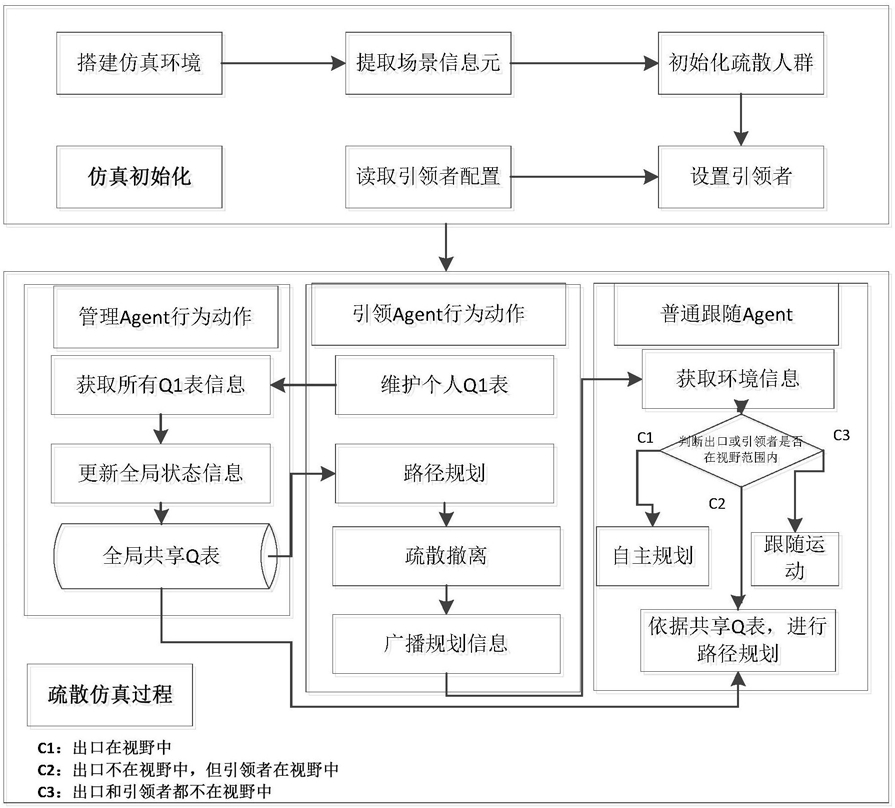 1.基于多Agent共享Q表的人群疏散仿真方法,其特征是,包括: