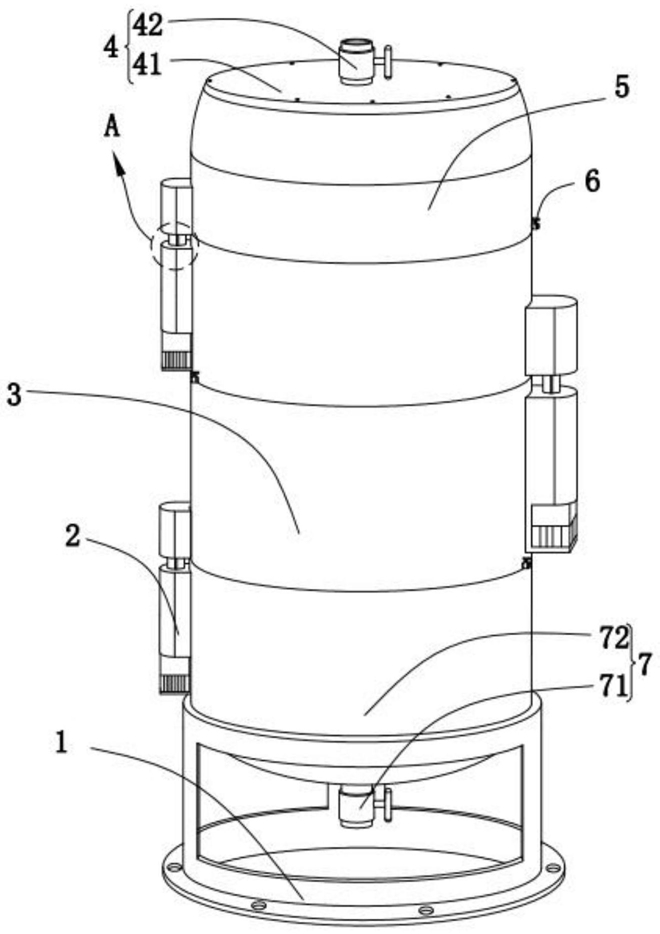 3.根据权利要求1所述的一种煤化工分离塔,其特征在于:所述导流结构(7)包括排料阀(71)和导流套(72),底端为半球形结构的所述导流套(72)固定于所述固定架(1),所述排料阀(71)连接于所述导流套(72)。