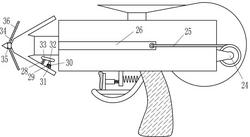 1.一种园林游客手持式喂鱼枪,其特征是:包括有枪体、握把、弧形架、滑轨、扳机、支杆、第一弹簧、转杆、卡杆、硬质弹簧、上挡块、右侧挡块、左挡块、右挡块、大弹簧、弹块、橡胶块、箭杆型饲料筒、底板、壳体、下料管、电动绕线轮、拉绳和箭头,枪体底部右侧设有握把,握把左侧上部设有弧形架,弧形架内侧左右两壁之间设有滑轨,滑轨上滑动式设有扳机,扳机右侧中部设有支杆,支杆右端连接有第一弹簧,枪体底部左侧开有小通孔,小通孔内后壁转动式连接有转杆,转杆上转动式连接有卡杆,卡杆穿过小通孔,卡杆左侧下部与第一弹簧右端连接,卡杆右侧下部连接有硬质弹簧,硬质弹簧右端与弧形架内右壁上部连接,枪体内顶部左侧设有上挡块,枪体内右壁设有右侧挡块,右侧挡块左侧上部与上挡块右侧接触,枪体内底部左侧设有左挡块,枪体内底部右侧设有右挡块,右挡块右侧与右侧挡块左侧下部接触,右侧挡块左侧中部连接有大弹簧,大弹簧左端连接有弹块,弹块左端设有橡胶块,橡胶块左侧与箭杆型饲料筒右端接触,箭杆型饲料筒位于上挡块、左挡块和右挡块之间,箭杆型饲料筒穿过枪体左壁,箭杆型饲料筒内左壁下部转动式连接有底板,底板右部镶嵌式设有壳体,卡杆上部位于壳体内,箭杆型饲料筒顶部右侧开有圆形通孔,枪体顶部中间镶嵌式设有下料管,下料管底部位于圆形通孔正上方,枪体右侧下部设有电动绕线轮,电动绕线轮上绕有拉绳,枪体前侧左部中间开有方形通孔,拉绳左端与方形通孔内后壁右侧连接,箭杆型饲料筒左端设有箭头。