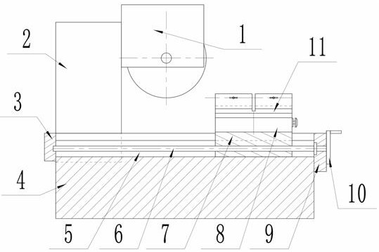 所述固定块一(3)固定连接在导槽(5)左端上;所述活动座(7)顶部固定连接有旋转调节装置(8),所述活动座(7)下侧螺纹孔活动连接在螺杆(6)上;所述螺杆(6)左端固定连接在固定块一(3)右侧盲孔中,所述螺杆(6)右侧活动连接在固定块二(9)内部通孔中,所述螺杆(6)右端上固定连接有手轮(10);所述固定块二(9)固定连接在导槽(5)右端上;所述夹持装置(11)底部固定连接在旋转调节装置(8)顶部;