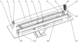 1.一种塔式光热发电反射镜镜面清洗装置,其特征在于,包括依次设置在支架板(1)上的风洗装置、水洗装置和刷洗装置;风洗装置包括通过风刀支架(16)水平固定于支架板(1)上方的风刀(14),所述风刀(14)为筒状,其侧壁沿轴向设有倒V型的吹风口,其端部通过气管(13)连接到风机;所述水洗装置包括通过方管支架(7)水平固定于支架板(1)上方的方管(5),所述方管(5)侧壁排布多个喷嘴(6),其端部通过水管(13)连接到水泵;所述刷洗装置包括电机(11)和通过滚刷支架(2)水平设置于支架板(1)上方的滚刷(4),滚刷(4)的转轴通过电机减速器(10)连接倒电机(11)的输出轴;支架板(1)上还设有用于将风洗装置、水洗装置和刷洗装置调整到位的使镜面贴合部分。