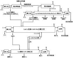 3.根据权利要求1所述的方法,其特征为进入CePr/Nd支体工艺的进口有机相是由碱皂有机相S先流入CePr/Nd支体工艺的前置稀土皂段,用该支体工艺的部分出口水相CePr在稀土皂段制成CePr稀土皂有机相,然后从CePr/Nd支体工艺的第1级即出口水相级流入CePr/Nd支体工艺;或从La/高纯Ce/Pr分离工艺的CePr料液进料位置附近级引出有机相作为CePr/Nd支体工艺的进口有机相,从CePr/Nd支体工艺的第1级即出口水相级流入CePr/Nd支体工艺。