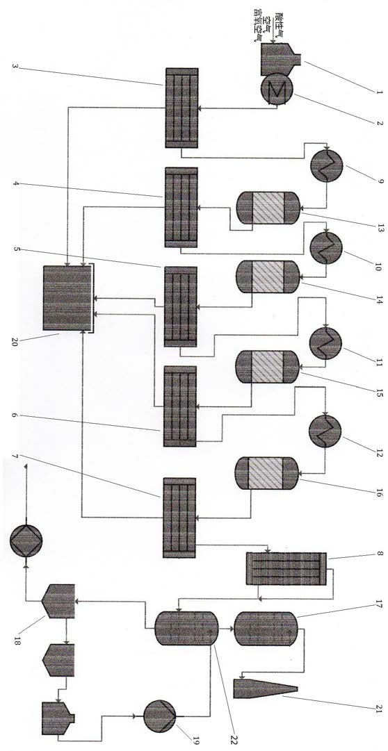 1.一种中低浓度酸性气的硫磺回收工艺,用于处理含H2S20-50v%的酸性气,主要设备沿酸性气流向包括依次串接的燃烧炉、一级克劳斯反应器、二级克劳斯反应器、选择性加氢还原反应器、选择性氧化反应器、循环吸收单元;燃烧炉附带废热锅炉,克劳斯反应器、选择性加氢还原反应器、选择性氧化反应器前后分别设置第一至第五冷凝器,和第一至第四加热器;第一至第五冷凝器分别将过程气中的气态硫冷凝为液硫,液硫流入液体硫磺槽储存;第一至第四加热器分别将从第一至第四冷凝器顶部出来的过程气加热到所需温度再进入相应反应器;其中,一级克劳斯反应器上部装填Fe2O3/Al2O3脱氧保护型硫磺回收催化剂,下部装填TiO2基硫磺回收催化剂或纯TiO2硫磺回收催化剂;所述脱氧保护型硫磺回收催化剂除了具有克劳斯反应活性,还将过程气中的O2通过与H2S反应生成单质硫而除掉;所述TiO2基硫磺回收催化剂或纯TiO2硫磺回收催化剂除了具有克劳斯反应活性,还将过程气中的COS、CS2接近于全部转化为单质硫或H2S,COS、CS2总含量≤10mg/m3;二级克劳斯反应器装填硫磺回收催化剂,在低于一级克劳斯反应温度的条件下,进行进一步的克劳斯反应转化,所述硫磺回收催化剂为TiO2基硫磺回收催化剂、TiO2/Al2O3硫磺回收催化剂以及Al2O3硫磺回收催化剂中的一种或两种;该二级克劳斯反应器出口过程气中H2S+SO2的含量≤1.5v%;选择性加氢还原反应器装填CoO-MoO3/Al2O3或CoO-MoO3/ TiO2-Al2O3选择性还原SO2催化剂,利用燃烧炉中生成的H2将SO2接近于全部还原,主要产物为单质硫;选择性氧化反应器装填选择性氧化H2S催化剂,利用该反应器入口前通过引入空气补入的O2将H2S选择性氧化为单质硫,副产物为SO2;该选择性氧化反应器出口过程气中H2S含量≤500mg/m3,SO2含量≤1000mg/m3;所述选择性氧化H2S催化剂以SiO2 为载体,Fe2O3 3-10m%,CaO 0-3m%,Cr2O30-5m%;催化剂平均孔直径30nm以上,表面积40-60m2/g、孔体积0.5-0.6ml/g;循环吸收单元包括串接的吸收液塔和吸附剂塔,其中吸收液塔通过循环吸收液主要吸收处理SO2,并转化为亚硫酸盐、硫酸盐,吸附剂塔通过装填的吸附脱硫剂床层主要将H2S吸附、氧化为单质硫而脱除;吸收液塔内设置供过程气、循环吸收液分布和接触的填料和/或喷淋、雾化部件,循环吸收液的pH5-10,操作温度20-50℃,主要水量来源为过程气所含蒸汽的冷凝水,循环吸收液维持正常运行外的富余液送往污水装置处理,或送往燃煤锅炉烟气湿法脱硫单元处理并作为补充水源,或送往燃煤锅炉作为煤炭淋水,循环吸收液为含碱液和/或含钙液,其中含碱液为通过补充氢氧化钠、碳酸钠或碳酸氢钠维持吸收能力的含亚硫酸钠和/或硫酸钠溶液,含钙液为通过补充氧化钙、氢氧化钙、超细碳酸钙维持吸收能力的含亚硫酸钙和/或硫酸钙浆液;循环吸收单元采用含钙液时,在吸收塔过程气入口设置第六冷凝器,过程气先经第六冷凝器冷却至20-50℃,将部分蒸汽冷凝成水、所含硫磺雾滴、粉粒捕集形成含硫磺粉的料液,料液分离硫磺粉浆后再进吸收塔或其附属的循环吸收液储罐并配加氧化钙、氢氧化钙、超细碳酸钙进行循环吸收;所述硫磺回收工艺包括如下步骤:1)酸性气与所需量空气和/或富氧空气混合后进入燃烧炉进行燃烧,燃烧炉的温度控制在1050-1300℃,燃烧后产生的过程气进入废热锅炉后冷却到260-350℃,过程气从废热锅炉出口进入第一冷凝冷却器冷却到140-170℃,在燃烧炉中生成的单质硫冷凝后与过程气分离进入液体硫磺槽;2)从第一冷凝器顶部出来的过程气加热到所需温度210-250℃,进入一级克劳斯反应器进行克劳斯反应及COS、CS2的水解;控制该反应器入口气的温度使反应器中催化剂床层下部达到COS、CS2充分水解的温度,其中TiO2基硫磺回收催化剂时为320-350℃,纯TiO2硫磺回收催化剂时为300-350℃;出口过程气进入第二冷凝器冷却到130-160℃,使生成的单质硫与过程气分离后进入液体硫磺槽;3)从第二冷凝器顶部出来的过程气加热到210-230℃后进入二级克劳斯反应器进行克劳斯反应进一步生成单质硫,出口过程气进入第三冷凝器冷却到130-160℃,使生成的单质硫与过程气分离后进入液体硫磺槽;4)从第三冷凝器顶部出来的过程气加热到200-220℃,进入选择性还原反应器;从选择性还原反应器出来的过程气进入第四冷凝器冷却到130-150℃,生成的单质硫与过程气分离后进入液体硫磺槽;5)从第四冷凝器顶部出来的过程气补入所需量空气并混匀后,加热到190-210℃后进入选择性氧化反应器;从选择性氧化反应器出来的过程气进入第五冷凝器冷却到120-140℃,生成的单质硫与过程气分离后进入液体硫磺槽,过程气经可选的液硫捕集器捕集硫雾并流入液态硫磺槽后,进循环吸收单元处理;6)从第五冷凝器顶部或液硫捕集器出来的过程气,进循环吸收单元处理后经烟囱排空;其中循环吸收液采用含碱液时,过程气的降温、部分蒸汽冷凝成水、所含硫磺雾滴、粉粒及SO2、H2S的捕集,都由含碱液的循环喷淋或雾化吸收实现,碱液由循环冷却水控制温度,碱液循环过程中分离硫磺粉浆,或富余液在送往污水装置处理或送往燃煤锅炉烟气湿法脱硫单元处理前分离硫磺粉浆;其中循环吸收单元采用含钙液时,过程气先经所设置的第六冷凝器冷却至20-50℃,所得含硫磺粉的蒸汽冷凝液分离硫磺粉浆后进循环吸收塔。2.权利要求1所述酸性气的硫磺回收工艺,其特征在于,所述一级克劳斯反应器、二