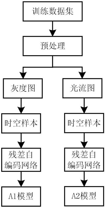 将训练数据集的光流图像时空样本集Or输入到步骤(2)的残差自编码网络中进行迭代训练,以输出数据与输入数据的均方误差作为训练的目标函数,最大迭代次数为200次,或者目标函数相比于上一次迭代结果的变化值小于0.1时,停止迭代;训练完成后得到基于光流图像数据重构的模型A2;将光流图像时空样本集Or输入到模型A2中,得到模型A2输出数据,将输入数据与模型A2输出数据相减结果的二范数作为重构误差,重构误差的最大值,记作β;