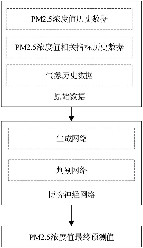 步骤4、采用博弈神经网络预测PM2.5浓度值,过程如下:步骤4.1、将生成网络中生成的模拟数据与原始数据输入判别神经网络,建立博弈神经网络并训练;
