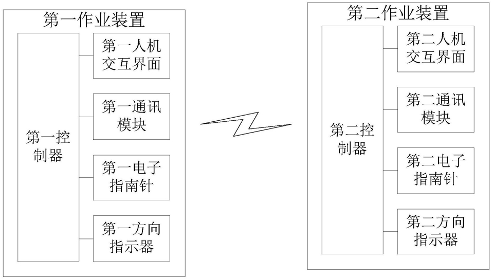 1.一种煤矿用深井协同作业引路系统,其特征在于,包括第一作业装置和第二作业装置,所述第一作业装置包括第一控制器以及分别与第一控制器连接的第一通讯模块、第一人机交互界面、第一电子指南针和第一方向指示器,所述第二作业装置包括第二控制器以及分别与第二控制器连接的第二通讯模块、第二人机交互界面、第二电子指南针和第二方向指示器;