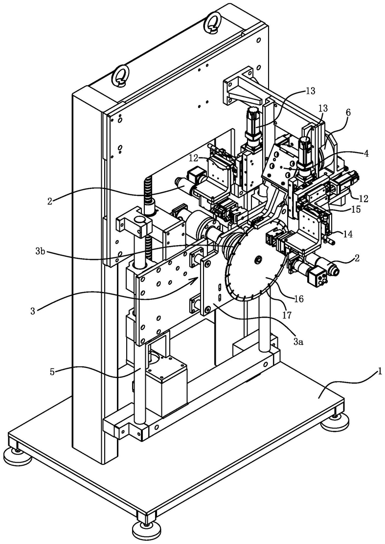 3.根据权利要求1所述的圆锯片激光焊接装置,其特征在于,所述基体夹具(3)包括升降板(3a)和夹具体(3b),夹具体(3b)位于升降板(3a)的前侧,夹具体(3b)与升降板(3a)之间转动连接;升降板(3a)上安装有分度驱动电机,分度驱动电机与夹具体(3b)机械连接;降板(3a)和机架(1)之间通过能使基体夹具(3)竖直升降运动的升降驱动结构(5)相连接。