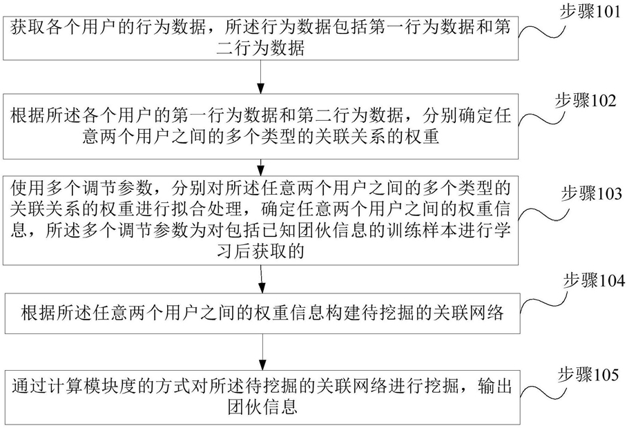 权重拟合模块,用于使用多个调节参数,分别对所述任意两个用户之间的多个类型的关联关系的权重进行自动拟合处理,确定任意两个用户之间的权重信息,所述多个调节参数为对包括已知团伙信息的训练样本进行学习后获取的;