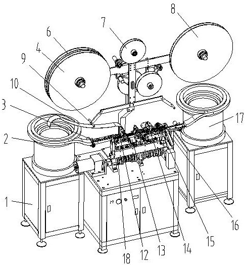 3.根据权利要求2所述的一种方便输送的SIM卡槽的贴膜组装机构,其特征在于,所述的检测装置包括设置在机架上并与输送槽(12)内的产品配合的CCD检测器(61),且机架上设置有与CCD检测器配合的检测器触动开关(62),所述的检测器触动开关(62)配合有检测器触动转块(63),所述的检测器触动转块(63)配合有检测器触动升降块(64),所述的检测器触动升降块设置在曲柄轴(18)上,所述的CCD检测器(61)连接到配电控制箱(1)。