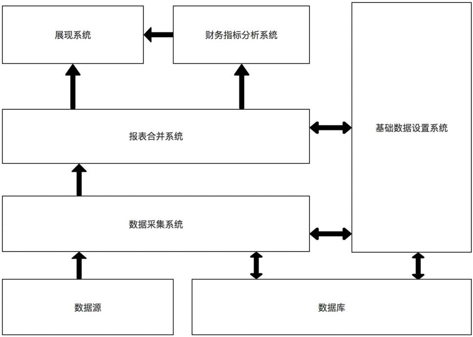 一报表合并系统,其包括一报表底稿生成模块、一调整抵消分录模块及一合并报表输出模块,所述报表底稿生成模块将所述通用报表加和生成初始报表底稿,该初始报表底稿通过调整抵消分录模块根据所述合并规则生成的调整抵消分录处理生成最终报表底稿,该最终合并报表录入合并报表输出模块得到合并报表;以及一财务指标分析系统,其包括一盈利分析模块、一偿债能力分析模块及运营能力分析模块,所述盈利分析模块根据所述合并报表计算盈利能力,所述偿债能力分析模块根据所述合并报表计算偿债能力,所述运营能力分析模块根据所述合并报表计算运营能力。