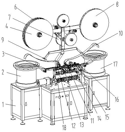 3.根据权利要求2所述的一种SIM卡槽插芯的切槽机构,其特征在于,所述的连接槽切槽装置包括设置在曲柄轴(18)上的连接槽切槽块撑开曲柄(51)和设置在机架上的连接槽切槽座,所述的连接槽切槽座上设置有相互配合的后部磁铁块(49)和前部磁铁块(50),所述的后部磁铁块(49)和前部磁铁块(50)上均设置有与输送槽(12)上的插芯配合的连接槽切槽块(46),所述的连接槽切槽块支撑曲柄(51)的上部为尖锥形且从前部磁铁块(50)和后部磁铁块(49)的中间穿过。