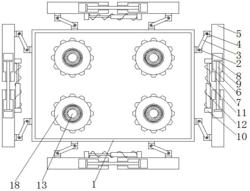 1.一种汽车齿轮用具有防止碰撞功能的存放设备,包括存放箱(1),其特征在于:所述存放箱(1)的右侧面固定连接有第一铰接座(2),所述第一铰接座(2)的一端铰接有铰接杆(3),所述铰接杆(3)的另一端铰接有第二铰接座(4),所述第二铰接座(4)的右侧面固定连接有第一防护板(5),所述第一防护板(5)的内部固定连接有限位槽(6),所述第一防护板(5)的背面开设有贯穿第一防护板(5)背端并连通限位槽(6)内部的活动槽(7),所述限位槽(6)的内部活动连接有限位块(8),所述限位块(8)的背面固定连接有第二防护板(9),所述第二防护板(9)的表面与活动槽(7)的内壁活动连接,所述第一防护板(5)的左侧面固定连接有固定块(10),所述固定块(10)的背面固定连接有伸缩杆(11),所述固定块(10)的背面固定连接有复位弹簧(12),所述复位弹簧(12)活动连接在伸缩杆(11)的表面,所述固定块(10)的数量为两个,且伸缩杆(11)和复位弹簧(12)的两端分别与两个固定块(10)的正面和背面固定连接,所述存放箱(1)内壁的上表面固定连接有限位杆(13),所述限位杆(13)的表面固定连接有卷紧片状钢条(14),所述卷紧片状钢条(14)的表面固定连接有限位管(15),所述限位管(15)的表面固定连接有橡胶垫(16),所述橡胶垫(16)的表面活动连接有齿轮(18),所述橡胶垫(16)的表面活动连接有分隔块(17),所述分隔块(17)的上表面与齿轮(18)的下表面固定连接。