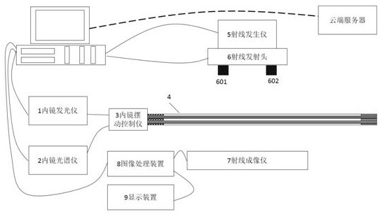 所述控制主机连接内镜发光仪(1)和内镜光谱仪(2),内镜光谱仪(2)和内镜发光仪(1)分别通过内镜摆动控制仪(3)连接内镜光纤管(4);所述射线发生仪(5)、射线发射器(6)、图像处理装置(8)连接控制主机,射线发射器(6)安装在射线发生仪(5)上,射线成像仪(7)连接图像处理装置(8),显示装置(9)连接图像处理装置(8);
