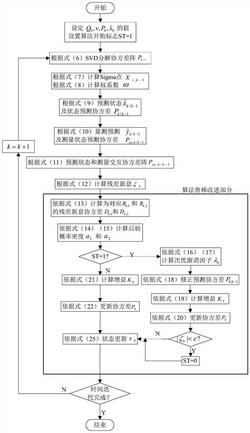 7.如权利要求1所述的一种抗野值鲁棒无迹卡尔曼滤波的动力电池SOC估计方法,其特征在于,步骤3中,采用改进的抗野值鲁棒无迹卡尔曼滤波算法对电池SOC进行估计,包括如下步骤:(1)状态和协方差初始化,设置算法起始标志位ST=1:(2)计算采样点其对应加权系数;